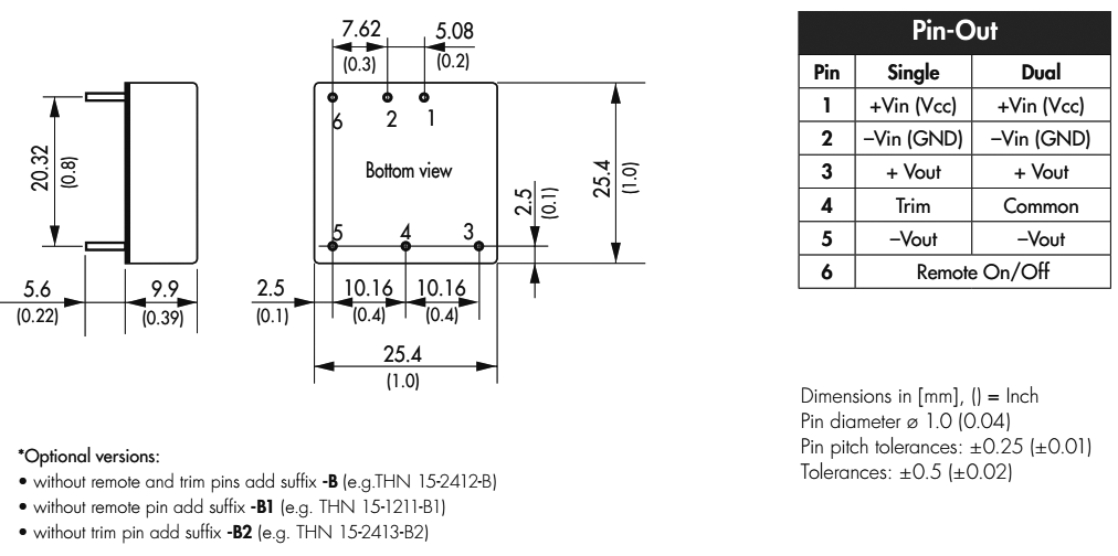 | THN15-1210 | 15 | 9...18 | 1 | 3.3 | 4000 | - | - | 84 | 25.4x25.4x9.9 |