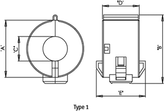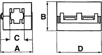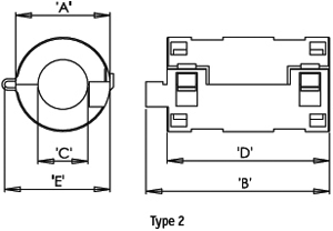 | Symbol | Enclosure material | Dimensions | Imp. @ 25MHz | Imp. @ 100MHz | Max. wire diam. | A | B | C | D | E | Design | Mounting |