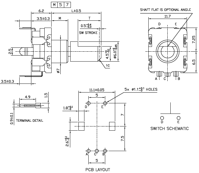 EC11E09244AQ | -40...85 | 9 | 18 | dos señales A y B | 10 | 5 | 15000 ciclos | 13 | 6 | 1,5 | con botón | 1,5 | - | - | - | - |
